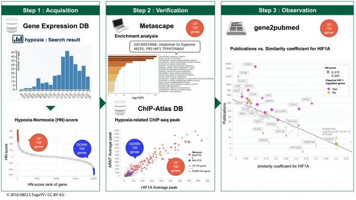 image: Step 1. Evaluation and listing of upregulation and downregulation of hypoxia-inducible genes. Step 2. Confirmation of known hypoxic stimulation-related genes. Step 3. Discovery of novel genes related to hypoxic stimulus-response.