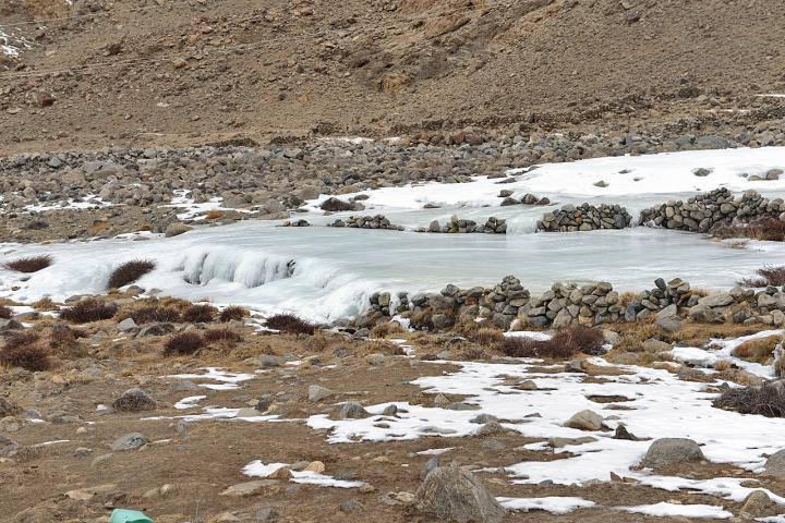 In the semi-arid Himalaya regions of India and Pakistan, meltwater from snow and glaciers plays an essential role for irrigation in local agriculture and hydropower generation. In this context, aufeis has been given little attention. It appears as thin sheet-like layers of ice that form through successive freezing of water and can be several meters thick. This phenomenon occurs on a seasonal basis below springsheds, along rivulets or streams under conditions of frequent freeze-thaw cycles. "In individual cases, this process is deliberately fostered through the construction of stone walls. These artificial reservoirs are used in some valleys of Upper Indus tributaries as water harvesting measures to bridge the seasonal water shortage in spring. However, the amount of ice, size and number of natural aufeis fields have been unknown so far," underlines Prof. Dr Marcus Nüsser from the South Asia Institute of Heidelberg University.