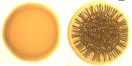 image: This image shows a smooth colony of Vibrio cholerae (left) next to a rough colony formed at 37C (right)