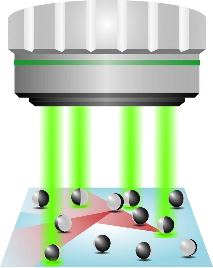 image: Schematic of the experimental setup: Depending on whether the coated glass beads have many or few neighbors within their field of vision (red), they are either illuminated by a laser beam or not. Researchers can use such an experiment to investigate the effects of visual information on the collective behavior and swarming of swimming microparticles.