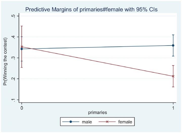In the case of primaries, a female candidate has a 14 percentage points lower likelihood of winning than a male candidate.
