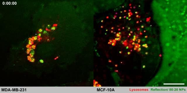 video: Time-lapse microscopy reveals the movements of lysosomes containing mixed-charge nanoparticle cargoes. Lysosomes in cancer cells (left) are slowed down and cluster around the cell center as compared to the directional trajectories of lysosomes in healthy cells (right).