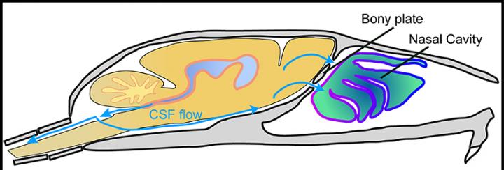 image: Schematic of the mid-sagittal plane of the mouse skull and brain. The pathway of cerebrospinal fluid flow is shown by blue arrows, flowing around the brain and spinal cord. Cerebrospinal fluid drains from the brain and into the nasal cavity through a bony plate known as the cribriform plate.