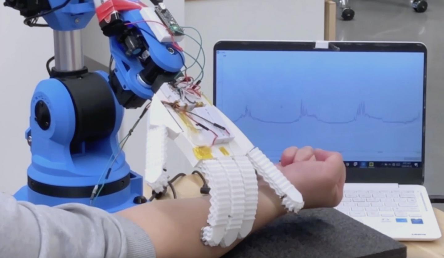 Kim's research team programmed two robots, a humanoid figure and a robotic arm, to measure human physiological signals, working from Kim's Additive Manufacturing Lab located in SFU Surrey's new engineering building. The robotic arm, created using Kim's 3D printed origami structures, contains biomedical electrodes on the tip of each finger. When the hand touches a person, it detects physiological signals, including those from an electrocardiogram (which monitors heartbeat), respiration rate, electromyogram (monitoring electrical signals from muscle movements) and temperature.