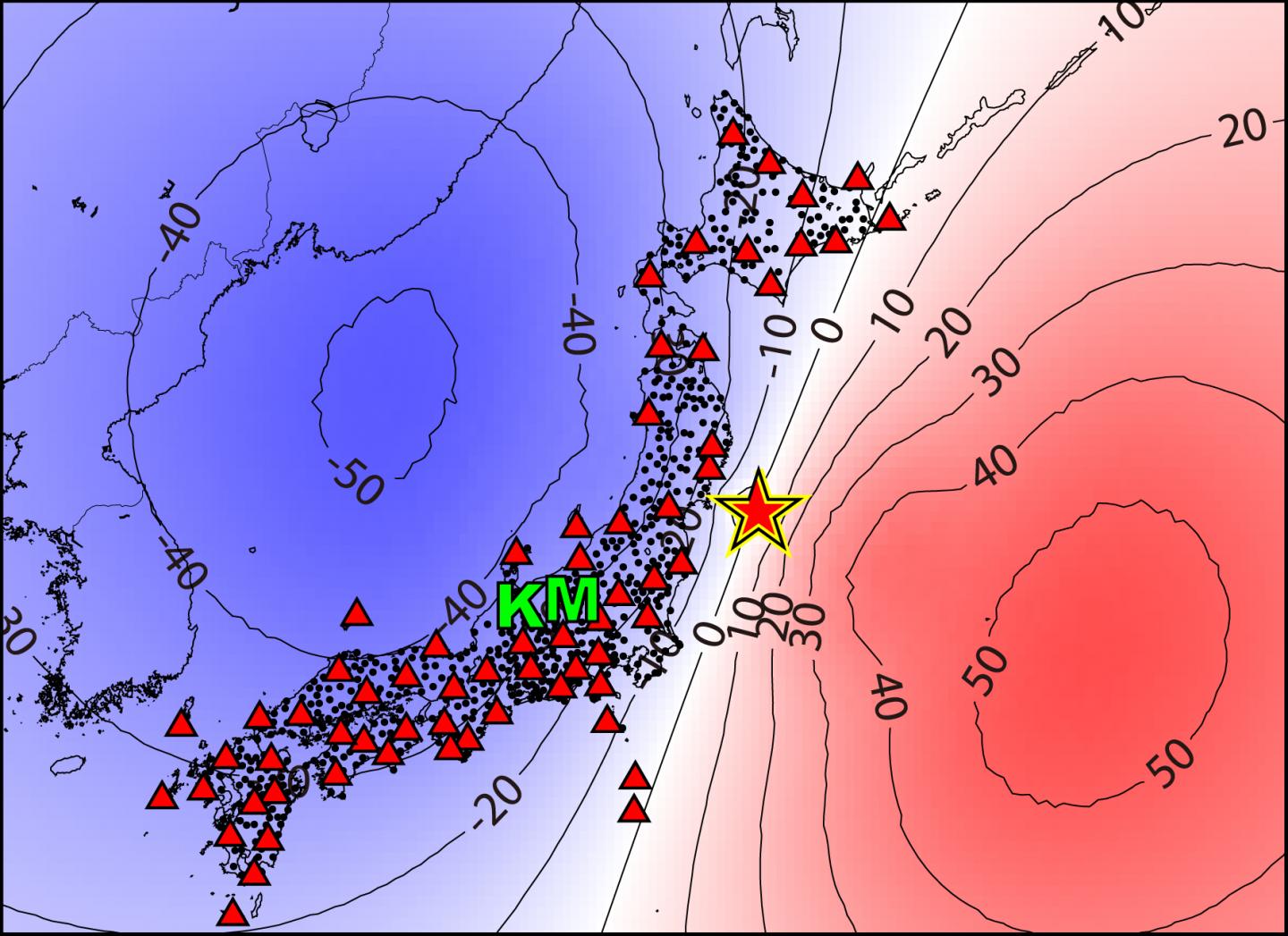 image: A map of Japan showing locations for the epicenter of the 2011 Tohoku earthquake (✩),Kamioka (K), Matsushiro (M) and seismic survey instruments used (△ and ●).