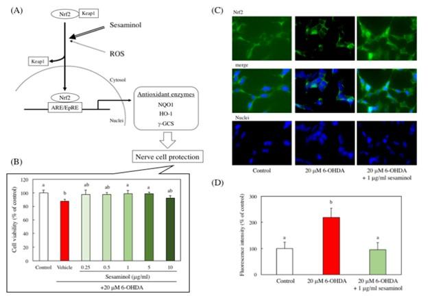 SH-SY5Y cells were incubated with 0.25~10 μg/ml of sesaminol for 2 h, followed by treatment with 20 μM 6-OHDA for 24 h. The cell viability was measured using the MTT assay. The results represent the means ± SD of 6 experiments. Values without a common letter are significantly different (p(C) Effects of 6-OHDA and sesaminol on nuclear translocation of Nrf2.