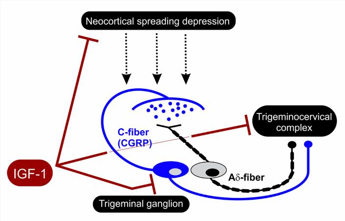 image: Intranasal IGF-1 inhibits trigeminal system activation caused by spreading depression, and reduced levels of calcitonin gene-related peptide, as well as other trigeminal pathway biomarkers.