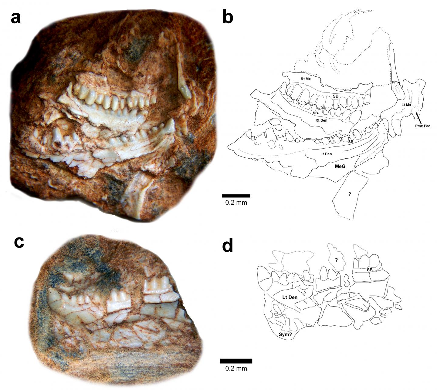 image: Holotype specimen of Clevosaurus hadroprodon. Photograph (a) and schematic drawing (b) of MMACR PV-027-T. Photograph (c) and schematic drawing (d) of additional jaw material (MMACR PV-028-T)