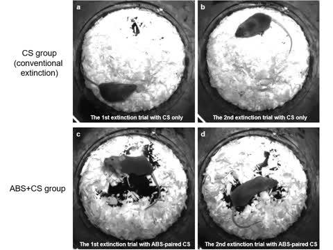 video: In the conventional fear reduction procedure (top), the CS group are subjected to the anxiety-producing sound without electric shocks. Since a freezing response decreases at a slow rate, mice exhibited extreme freezing responses both at the first (a) and second (b) auditory stimulations. In the ABS pairing (bottom), moving LED light was presented with the second auditory stimulation. While an extreme freezing response was also seen in mice at the first auditory stimulation (c), the pairing auditory stimulation with moving light (d) induced a significant decrease in mice's freezing response.