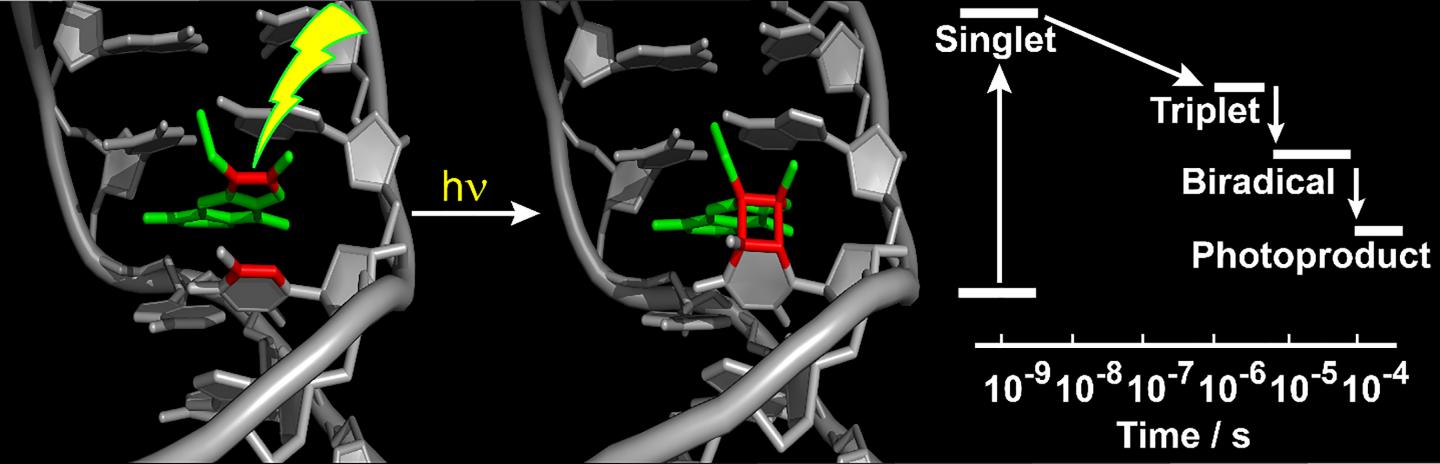 They found that - after the psoralen molecule has absorbed UV light - the reaction takes place in two stages. First, a single bond between the psoralen molecule and thymine forms. A second bond formation then yields a four-membered ring (cyclobutane) permanently connecting the two moieties (see figure). The researchers in Düsseldorf and Munich were also able to demonstrate that the first stage takes place within a microsecond, while the second needs around 50 microseconds. They compared this process with the damaging of the 'naked' DNA by UV light. That process also frequently results in cyclobutane rings, but the process takes place considerably faster than when psoralens are present.