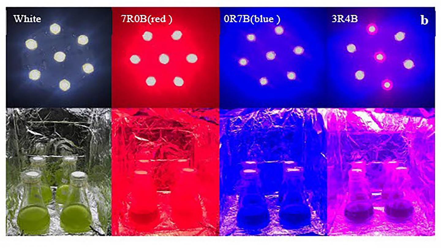 image: Researchers show how a combination of monochromatic red and blue LED illumination on one type of microalga can enhance its growth and increase the biosynthesis of critical components. Here, LED illuminators installed with different combinations of red and blue light, with white as the control light.