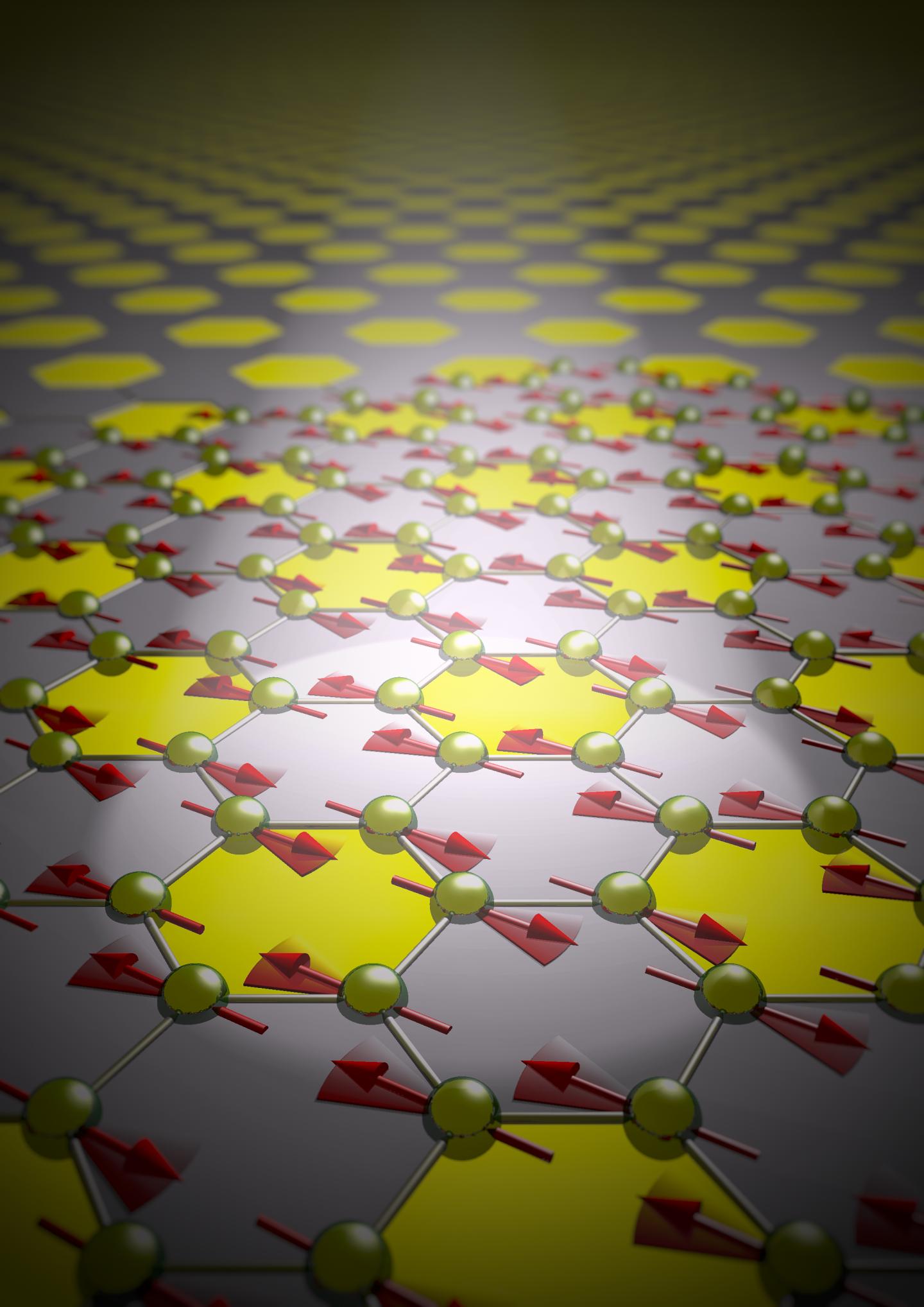 image: An artistic view of the magnetic spins in the two-dimensional magnet. All spins oscillate in-phase, at a high frequency, in response to the light pulse.