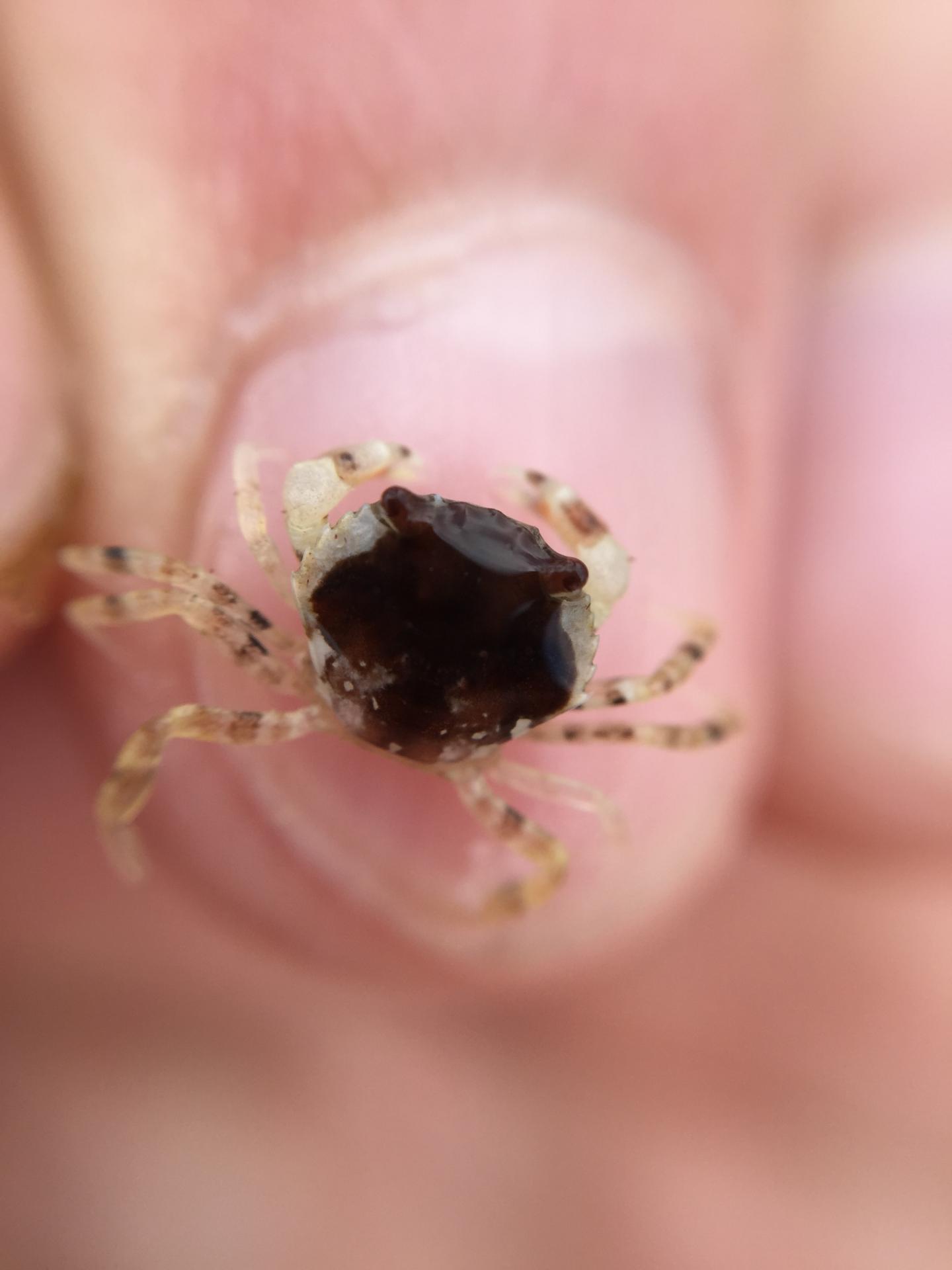 image: small, dark-colored juvenile shore crab on finger.