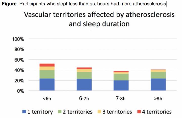 The PESA study enrolled 3,974 healthy middle-aged adults who wore a waistband activity monitor for seven days to record sleep quality and quantity. They were divided into five groups according to the proportion of fragmented sleep, and four groups designating average hours slept a night: less than six (very short), six to seven (short), seven to eight (the reference), and more than eight (long). Atherosclerosis was assessed in leg and neck arteries using three-dimensional ultrasound.
