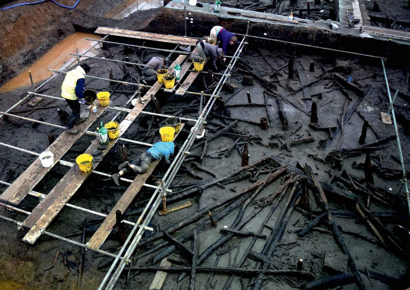 The structures collapsed vertically, and the heavy roofs brought everything down with them into the sediment of the channel. A tragedy for the inhabitants, but serendipitous for archaeologists, as the fluvial silts have preserved 'wooden artefacts, pottery sets, bronze tools and weapons, fabrics and fibres, querns, loom weights, spindle whorls, animal remains, plants and seeds, coprolites...'