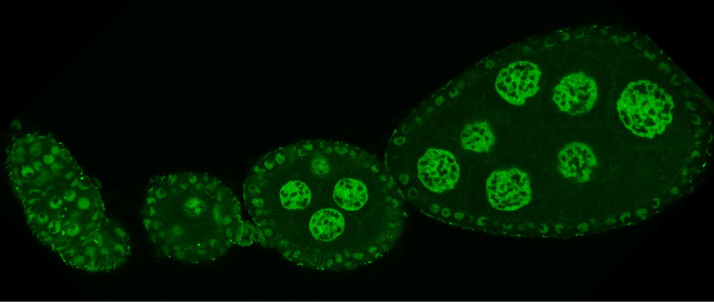 image: Confocal microscopy image of Cut up (Ctp/LC8), tagged with Green Fluorescent Protein (GFP), in a Drosophila ovary.