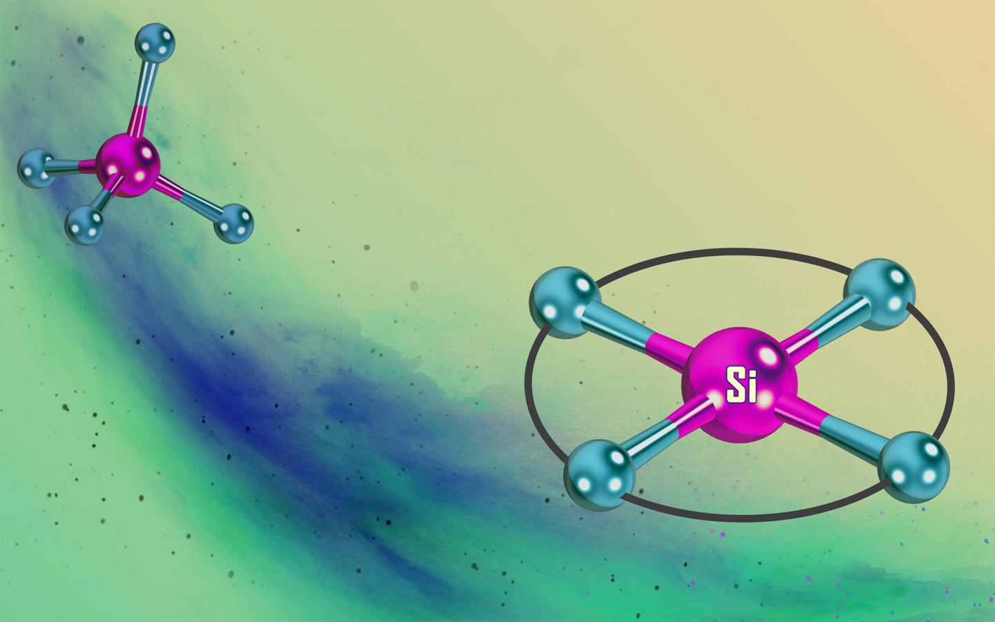 image: Changes to the natural tetrahedral structure of silicon (top left) in an unusual square planar geometry (bottom right).