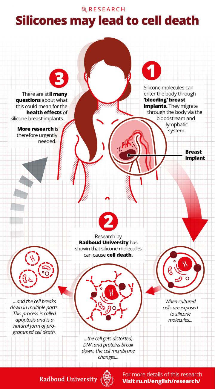 Silicone molecules from breast implants can initiate processes in human cells that lead to cell death. Researchers from Radboud University have demonstrated this in a new study that will be published on 12 June in Scientific Reports. "However, there are still many questions about what this could mean for the health effects of silicone breast implants. More research is therefore urgently needed," says Ger Pruijn, professor of Biomolecular Chemistry at Radboud University.