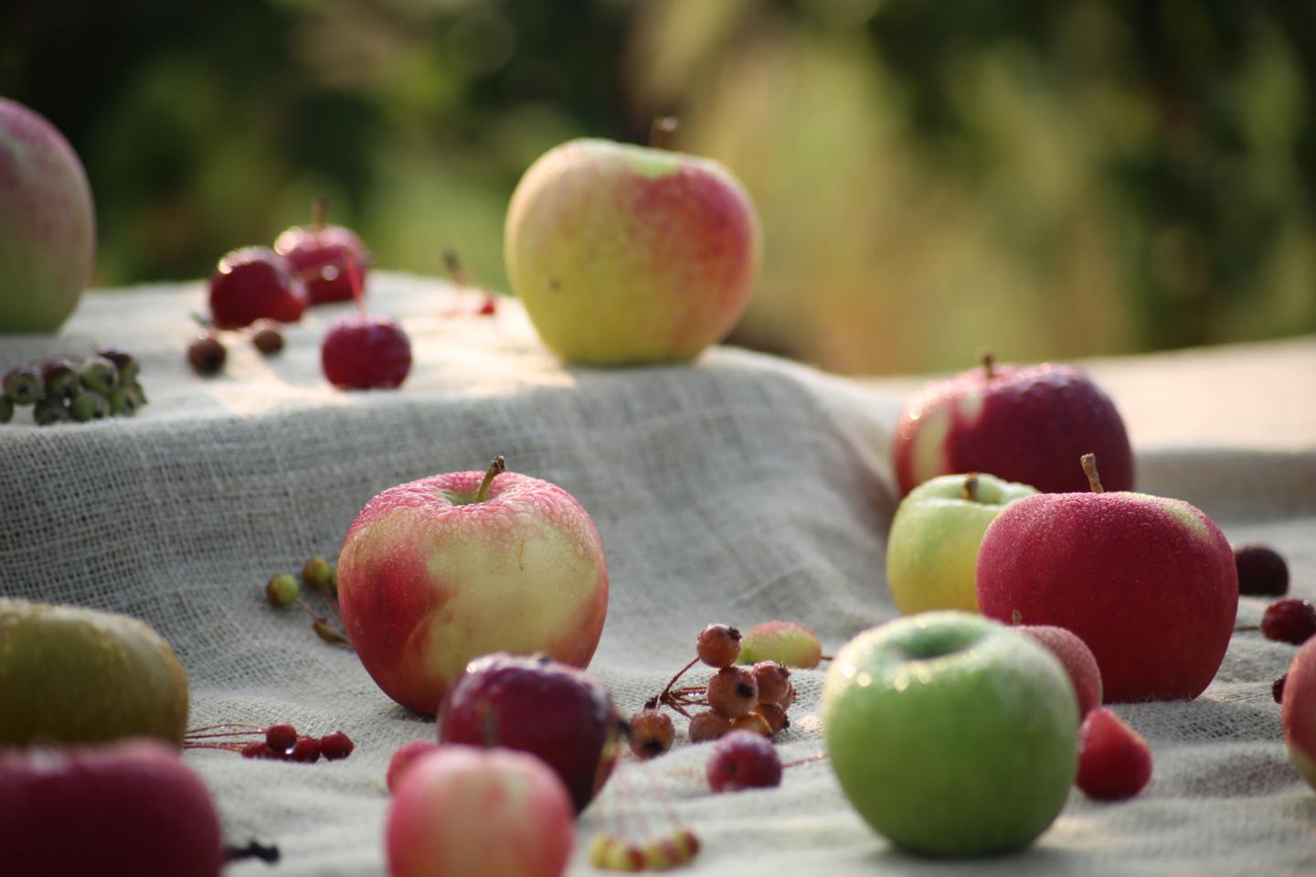 image: Examples of different colors, sizes and shapes of apples, a reflection of the diversity of the apple genetic resources or germplasm preserved in ARS Geneva.