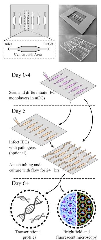 image: Researchers at Rice University and Baylor College of Medicine developed millifluidic perfusion cassettes (mPCs) that mimic conditions in the intestines to evaluate infections like those that cause diarrhea. The devices formed from 3D-printed molds (top right) were seeded with intestinal enteroid cultures (IECs) and infected with pathogens for 24 hours or more to see how infections take hold.