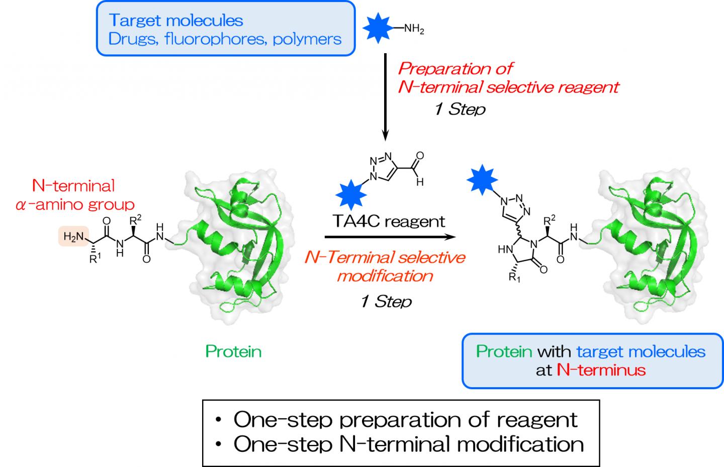 Osaka, Japan - Proteins are essential parts of organisms; thus, they are widely used in medicine, biology and chemistry. Enhancing their inherent properties by adding functional molecules to their structures is a common and important step in many fields. For example, adding fluorescent molecules allows proteins to be traced and quantified. Many different modification strategies with various advantages have been described. Osaka University researchers now report a simple N terminus-specific modification carried out under mild conditions using new reagents prepared in one step. Their findings were published online in ChemBioChem.