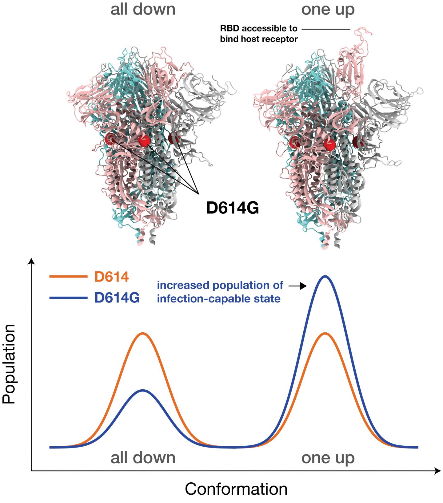 The simulations in this new research demonstrate that interactions among the building blocks of the Spike are more symmetrical in the new G-form variant than those in the original D-form strain. That symmetry leads to more viral Spikes in the open conformation, so it can more readily infect a person.