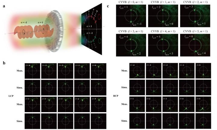 In a new paper published in Light Science & Application, a team of scientists, led by Professor Xiangang Luo from State Key Laboratory of Optical Technologies on Nano-Fabrication and Micro-Engineering, Institute of Optics and Electronics Chinese Academy of Sciences, and co-workers have showed that a single spin-decoupled metasurface that merges the geometric phase and dynamic phase could perform simultaneous SAM and OAM mode discrimination via momentum transformation, where vortex beams of different spins were transformed into focusing patterns on two separated halves of the screen on a transverse focal plane with topological charge-dependent azimuthal rotations. Further experimental investigations have proven that the single spin-decoupled metasurface possesses the ability to detect cylindrical vortex vector beams with simultaneous phase and polarization singularities. Spin-decoupled PMTs were experimentally demonstrated at several different wavelengths in the visible band. Finally, they showed that the proposed approach could be extended to sorting of superimposed OAMs with a proper mode interval. These results reported here may have many important applications in momentum measurement of both the spin and angular momentum and singularity detection of both phase and polarization singularities.