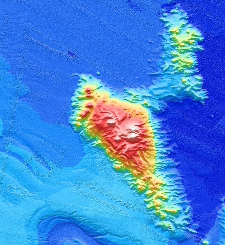 image: T?ranganui Knoll is an underwater mountain (seamount) off the coast of New Zealand that was the site of an International Ocean Discovery Program drilling expedition. The seamount will one day collide with the Hikurangi subduction zone, leading to conditions that both generate and dampen earthquakes.