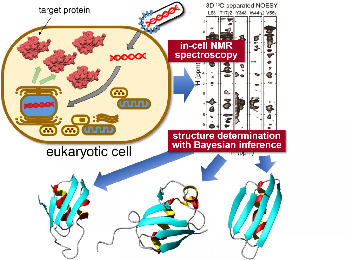 image: Target proteins are expressed inside sf9 cells, then measured using "in-cell" NMR spectroscopy. Unique statistical analysis with the help of Bayesian inference is applied to calculate the accurate 3D structure of the proteins with unprecedented precision.