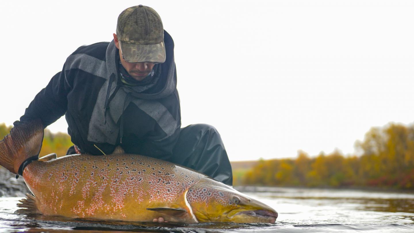 image: A large male salmon is sampled and released unharmed in the Teno River, northern Finland.