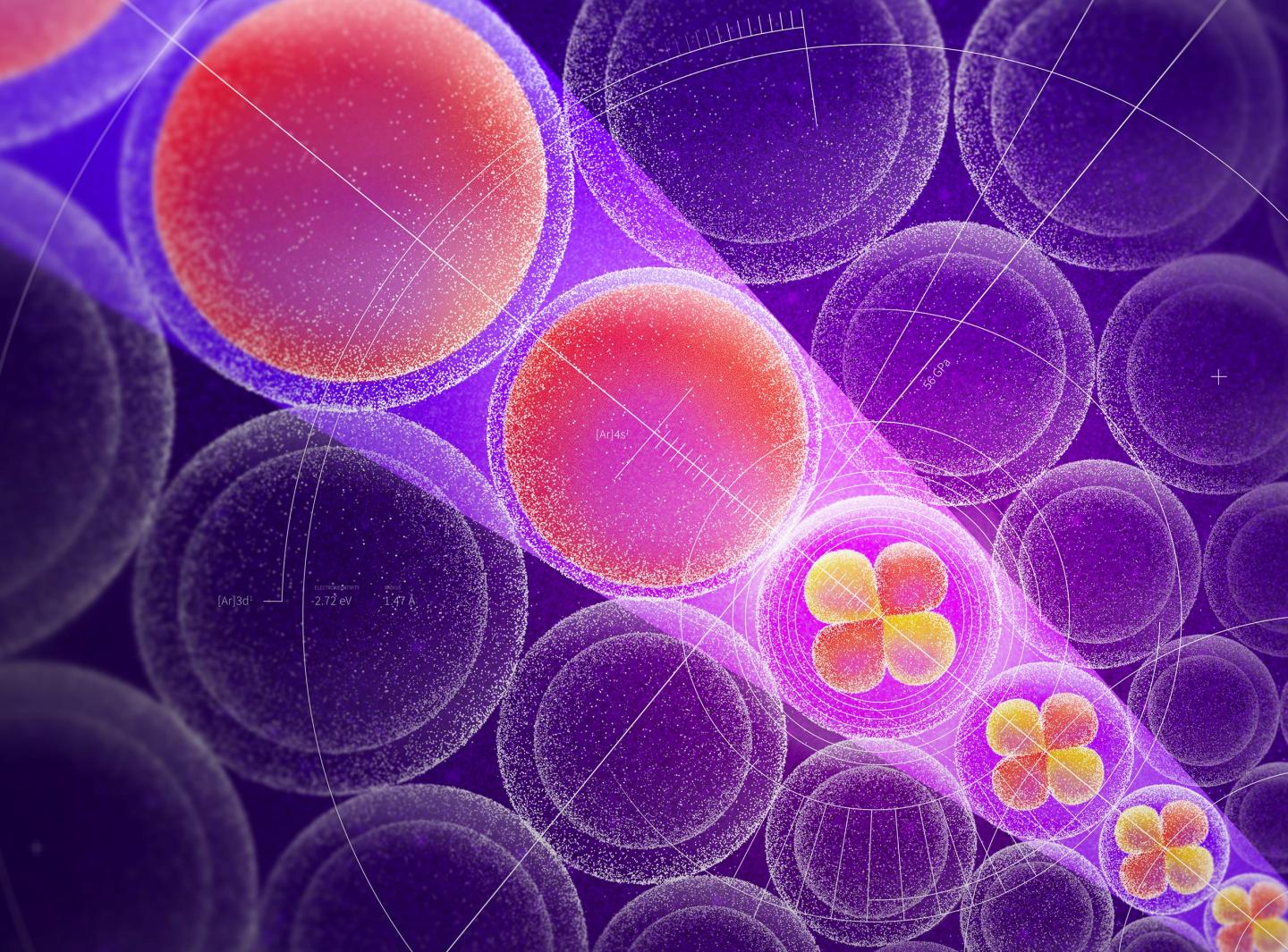 image: An illustration of potassium atoms undergoing changes in fundamental characteristics such as radius, energy and electronegativity as they are compressed by surrounding neon atoms