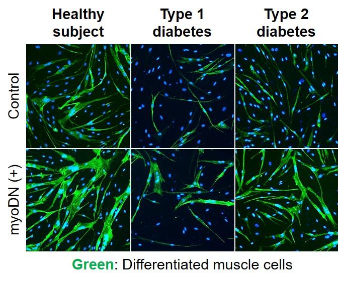 Myoblasts collected from healthy subjects, patients with type 1 diabetes, and patients with type 2 diabetes were used for this experiment. Compared to healthy subjects, diabetic myoblasts had a reduced ability to differentiate into skeletal muscle. Remarkably, administration of myoDN improved skeletal muscle differentiation exacerbated by diabetes. The group also found that glucose and fatty acids, which are increased in the blood of diabetic patients, induce an inflammatory response in myoblasts, and myoDN suppresses these inflammatory responses.