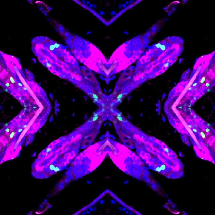 image: A digitally processed micrograph of mouse skin and hair follicles, with DNA damage (green) in the skin epithelium, including the hair follicle stem cells (purple). Blue depicts cell nuclei.