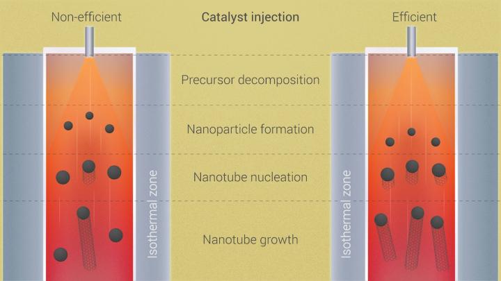 Skoltech researchers have investigated the procedure for catalyst delivery used in the most common method of carbon nanotube production, chemical vapor deposition (CVD), offering what they call a "simple and elegant" way to boost productivity and pave the way for cheaper and more accessible nanotube-based technology. The paper was published in the Chemical Engineering Journal.