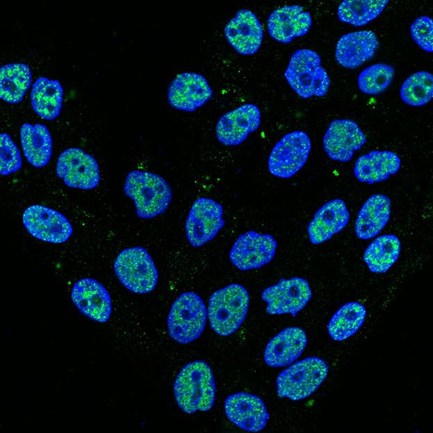image: Human breast cells, which are blue and oval-shaped, against a black background. Green spots inside the blue ovals depict DNA damage following irradiation exposure.