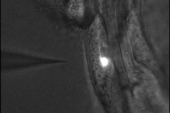 video: Scientists used sharp glass needles to extract a GFP-labeled cell from C. elegans and recorded the neuronal response of the cell to varying salt concentrations by patch-clamp technique. In this study, the authors demonstrated that salt evoked regenerative all-or-none membrane depolarization in C. elegans chemosensory neurons. This video shows scientists extracting a cell from C. elegans in order to conduct whole-cell recording.