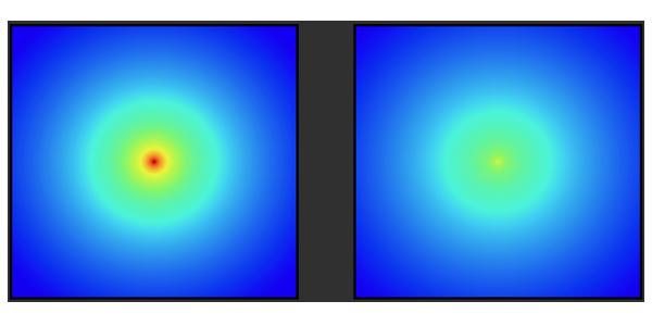image: A schematic of dark matter distributions where red indicates regions with higher dark matter density. The illustration on the left indicates that dark matter distribution becomes denser in the center of the galaxy, as this study found, whereas the illustration on the right shows a less dense distribution of dark matter according to SIDM.