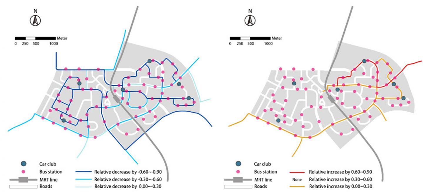 image: Spatial distribution changes in PT supply during the competition: (left) Routes with supply decrease; (right) Routes with supply increase