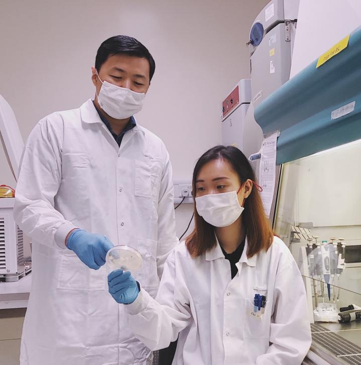image: SMART AMR researchers Boon Chong Goh (left) and Linh Chi Dam (right) evaluate the bacterial cells after treatment with lysins