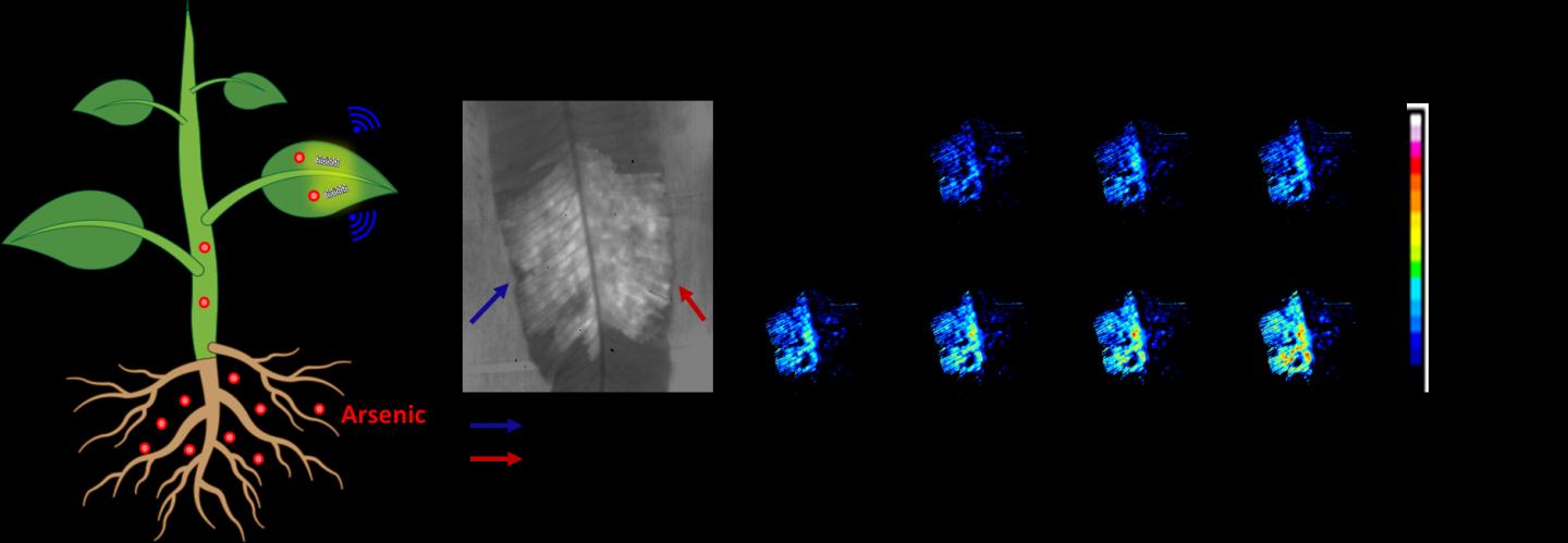 image: Non-destructive plant nanobionic sensor embedded within leaves to report arsenic levels within plants to portable electronics, enabling real-time monitoring of arsenic uptake in living plants.