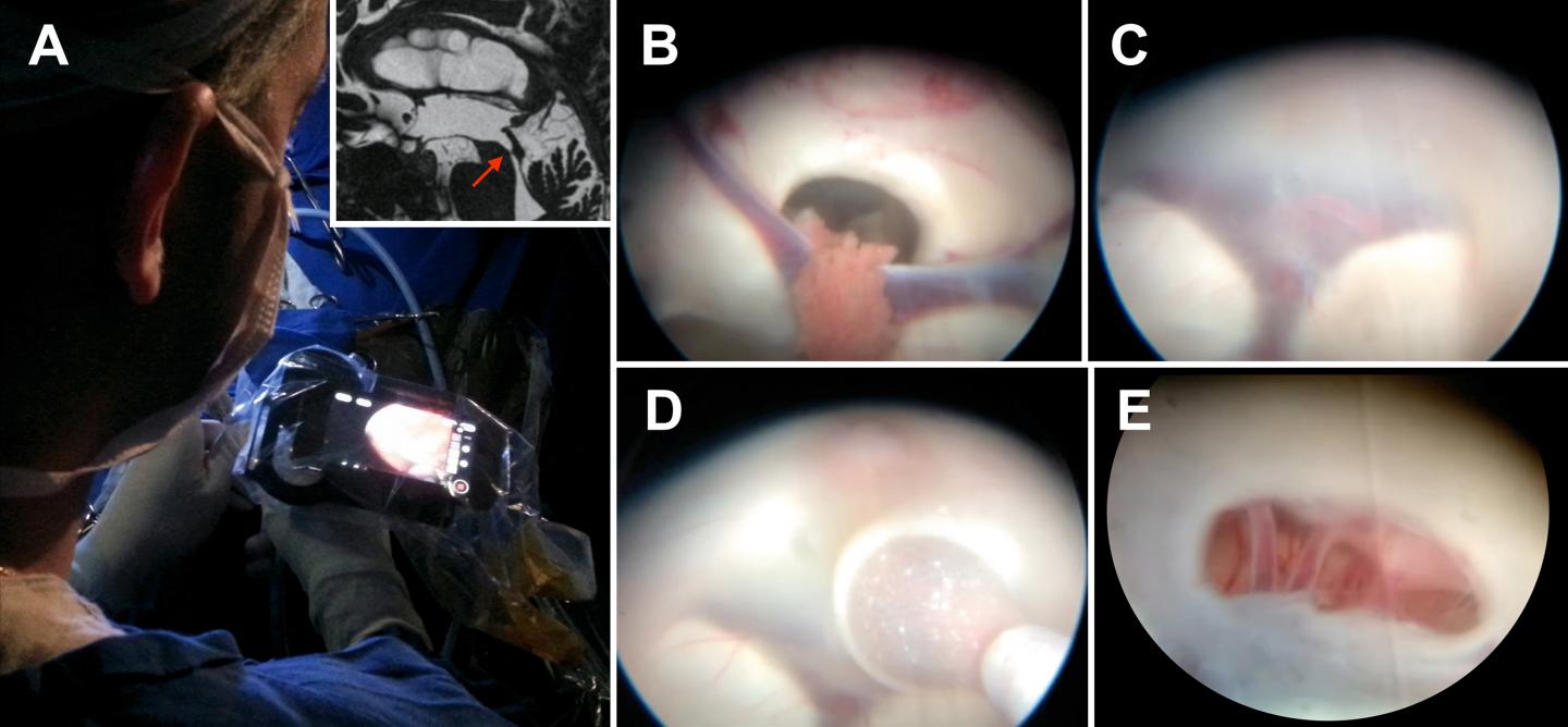 During minimally invasive surgeries performed in 42 patients, a fully charged smartphone (iPhone models 4, 5, and 6) was attached to the front of the neuroendoscope by means of an adapter. The primary surgeon focused directly on the iPhone screen in front of him or her, rather than off to one side where the video monitor normally stands. The smartphone relayed images from the screen via Wi-Fi to a video monitor placed elsewhere in the operating room.