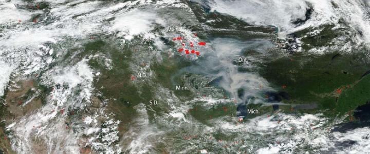 image: On July 7, 2019, the Suomi NPP satellite using its VIIRS (Visible Infrared Imaging Radiometer Suite) instrument captured this image of the fires ongoing in the region. Also visible in this image is the massive amount of smoke pouring off these fires and moving southeast into other parts of Ontario, over the Great Lakes, and into Michigan.