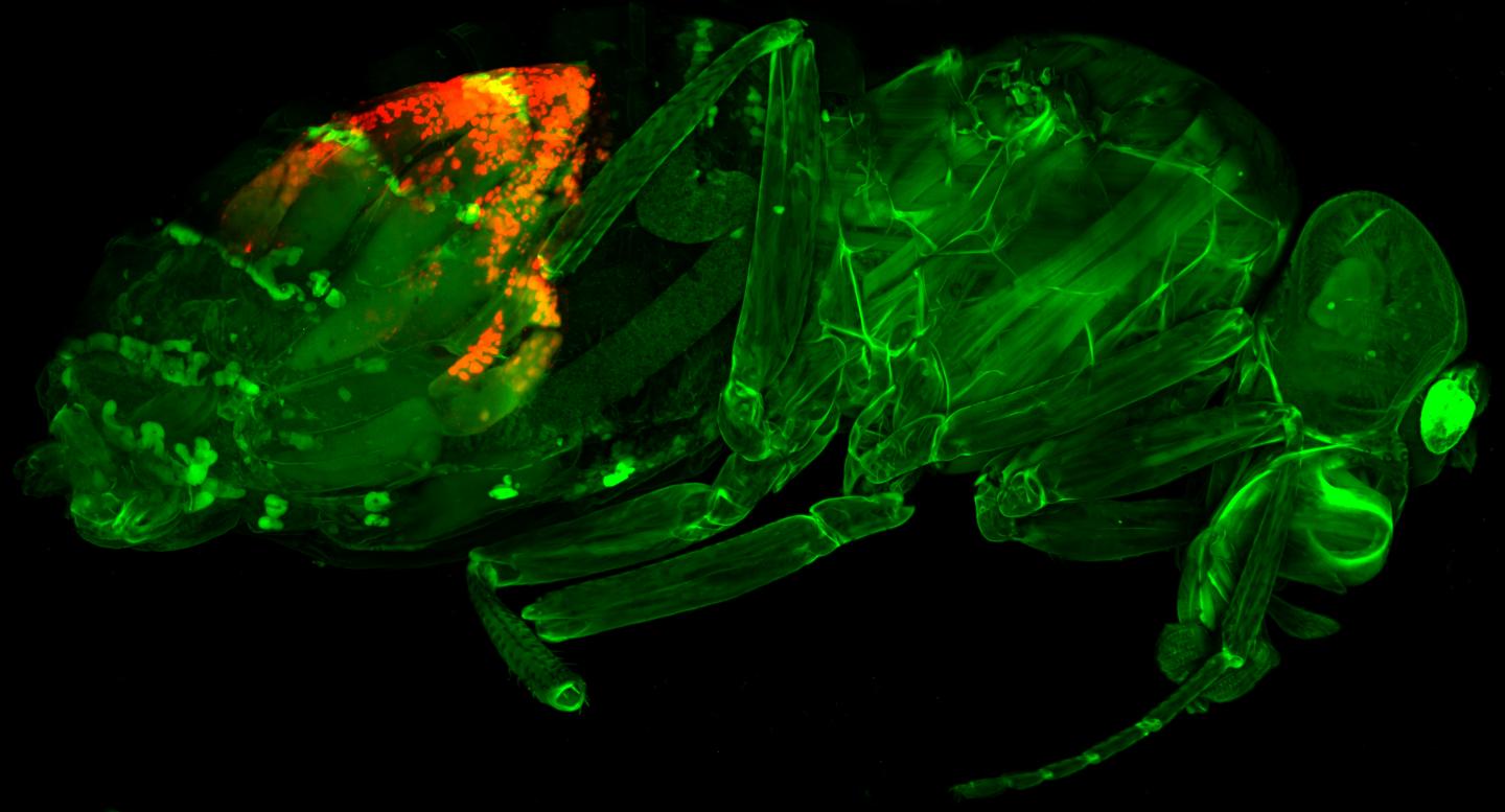 image: Microscopy image of an entire fruit fly (Drosophila melanogaster; body outline in green) with a protein central to the smuggling route (Nxf3) shown in red.