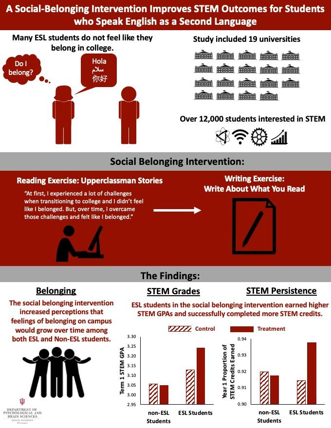 As co-author Mary Murphy, IU professor of psychological and brain sciences noted, "Because of the large sample size across so many universities this is one of the first studies to quantitatively examine and mitigate this important psychological barrier for ESL students in STEM fields as they begin college."