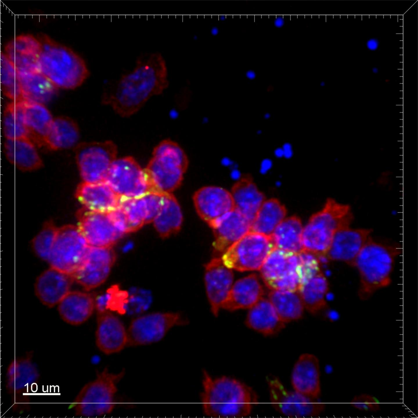 image: This image depicts T cells interacting with each other. Cell surfaces are labeled in red, cell nuclei in blue and receptors mediating communication in green.