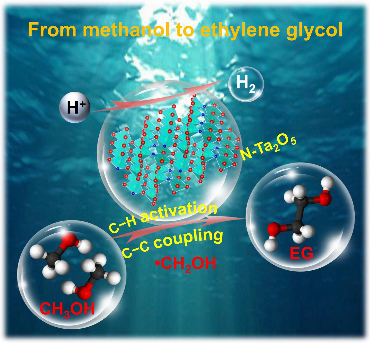 image: Direct photocatalytic coupling of methanol to ethylene glycol (EG) is highly attractive. The first metal oxide photocatalyst, tantalum-based semiconductor, is reported for preferential activation of C-H bond within methanol to form hydroxymethyl radical (* CH2OH) and subsequent C-C coupling to EG. The nitrogen doped tantalum oxide (N-Ta2O5) photocatalyst is an environmentally friendly and highly stable candidate for photocatalytic coupling of methanol to EG.