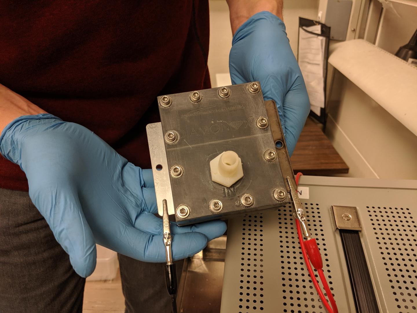 image: An electrochemical flow cell with a stainless steel cathode and a boron-doped diamond anode is used to treat a concentrated waste stream of GenX.