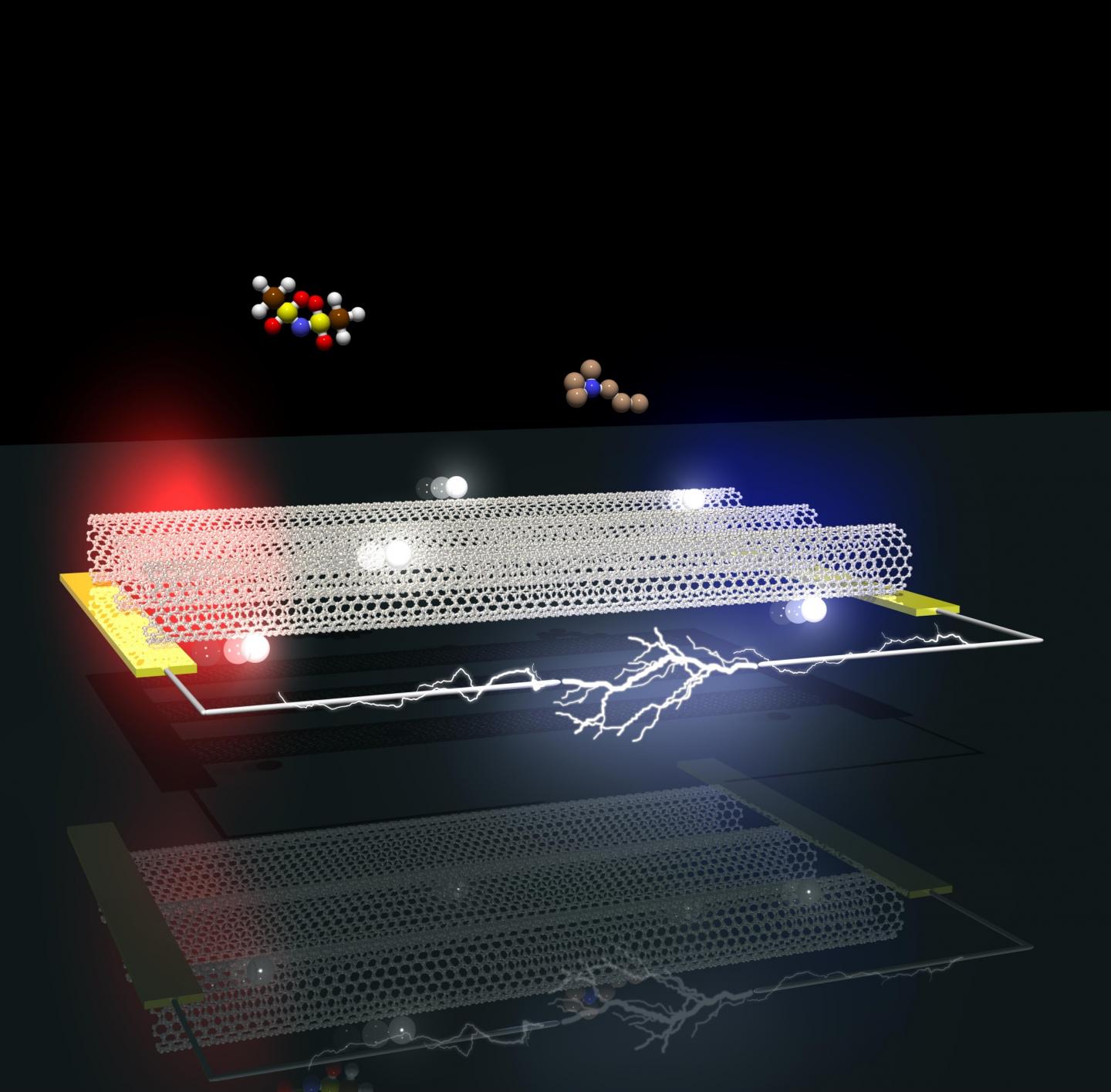 image: This is an illustration of aligned metallic carbon nanotubes in the team's thermoelectric device. A temperature gradient causes an electrical current to flow.