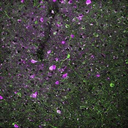 image: Section of a brain showing neurons that have nNOS-expressing neurons labeled in green, DREADD-expressing neurons in magenta. Neurons that express both show up as white.
