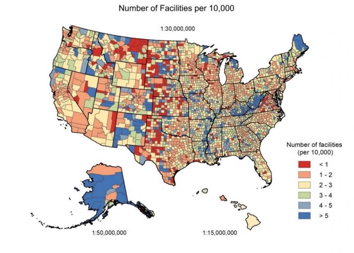 In what is believed to be the first county-level analysis of the nation's potential COVID-19 vaccine facilities, which include community pharmacies, federally qualified health centers, hospital outpatient departments and rural health clinics, the researchers found that more than a third (35%) of U.S. counties have two or fewer of these facilities and nearly 1 in 10 counties have fewer than one facility per 10,000 residents.